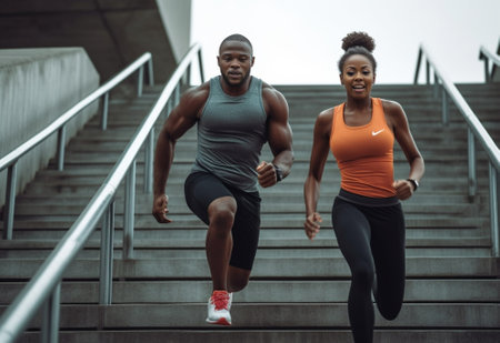 Young couple in sports clothing jumping and jogging while exercising on the steps outdoors : Generative AI
