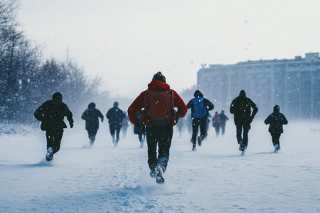 Back view of a group running together in deep snow, capturing energy, winter exercise, and shared outdoor adventure.