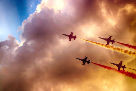 Airshow in Krakow, Poland. Demonstration flight of the Polish Air Force in the sky.