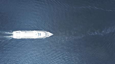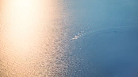 Aerial top down view of speed motor boat on open sea at summer day