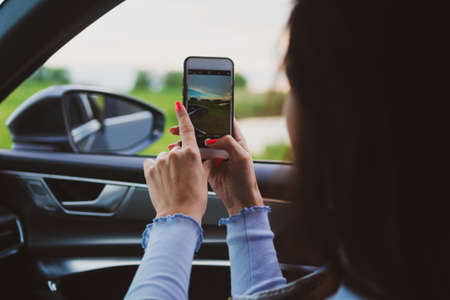 Brunette girl travel the roads in a car, take pictures with the phone. Vacation concept