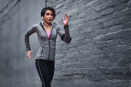 I choose to be fit. Cropped shot of an attractive young woman wearing earphones and workout clothes while running outside.