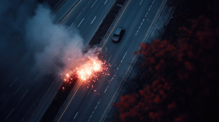 Smashed car in the center of a highway, emergency flares creating a perimeter around the scene