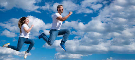 Father and daughter jump on sky, banner with copy space. father and daughter jump high. hurry up. happy childhood and fatherhood. concept of friendship