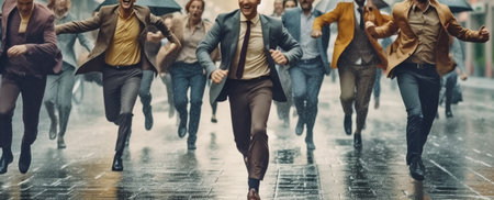 A group of people are joyfully running in the rain on a wet street, creating a picturesque scene resembling a watercolor painting in a natural landscape