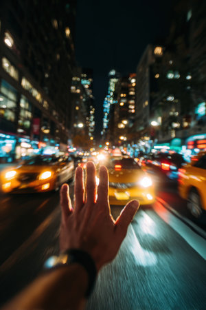 POV of Hailing a Taxi on a Busy Nighttime City Street