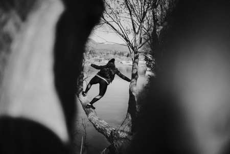 A frame in a frame monochrome shot of a woman climbing a tree captured between blurry tree trunks in