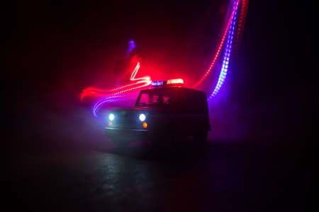 Police car chasing a car at night with fog background. 911 Emergency response police car speeding to scene of crime. Creative decoration. Selective focus