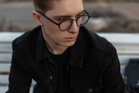 Fresh portrait European young man with clean healthy skin in stylish glasses in black fashionable denim jacket on street. Pretty modern urban guy fashion model outdoors. youth style.