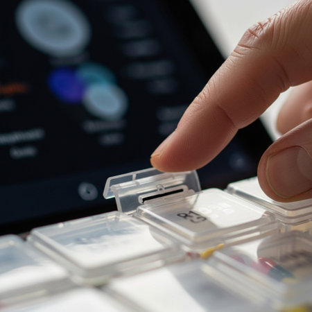 Close up view of a modern alarm system keypad, with glowing buttons casting shadows in an office space, emphasizing security and technology.
