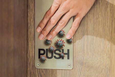Viruses on the doorknob. Coronovirus COVID 19. Human life through which germs and viruses spread, door handle. the concept of germs sitting on the door handle
