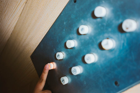 Home automation control. Finger activating smart buttons on wood.