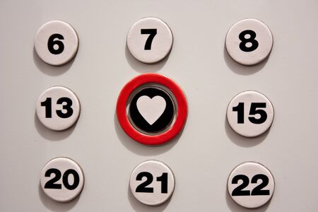 Control panel showing numbers with illuminated red button on left side and blurry background