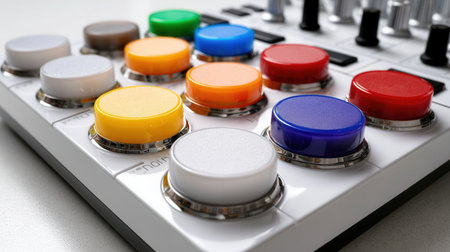 A close-up view of a high-tech control surface where vibrant, glowing buttons in a rainbow of colors await a users touch. This image evokes a sense of creativity, innovation, and control, perfect for concepts related to music production, gaming, or futuristic user interfaces.