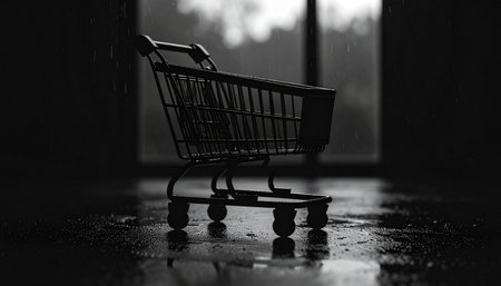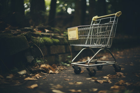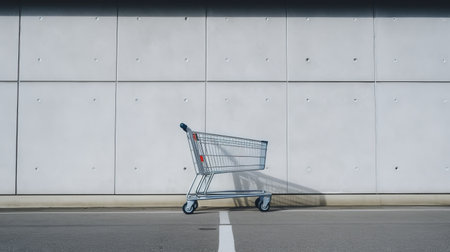 a cart stands in front of an empty shopping mall, captured in a minimalistic portrait style. the photograph showcases minimalist simplicity of forms, with minimal retouching applied. the image highlights grocery art, featuring an extreme angle and a dramatic use of shadows. the composition also includes creased elements. ai generated
