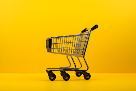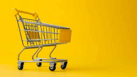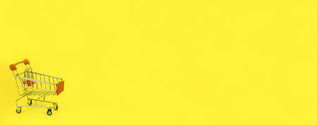 Minimalistic shopping concept. Shopping trolley on white-yellow background.
