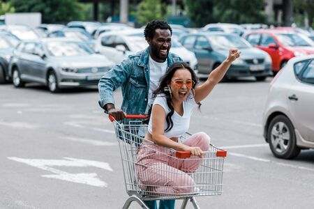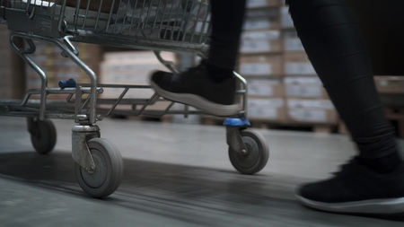 Closeup view on womans feet are jumping on a shopping trolley in the store. Female in sneakers is following a shopping cart