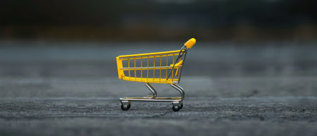 empty miniature shopping cart on brown background. Seasonal sale, copy space, online shopping