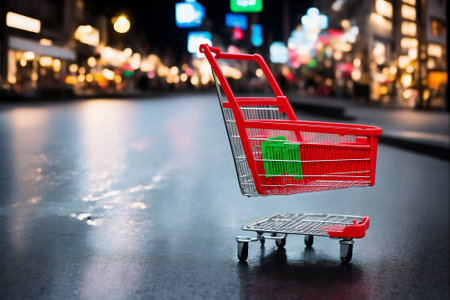 Shopping cart on road in city at night. Online shopping concept.
