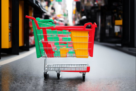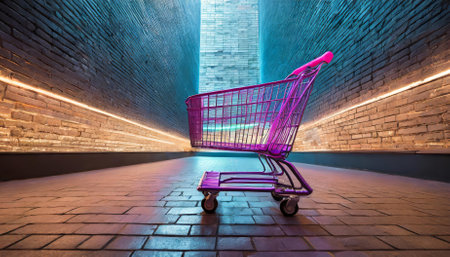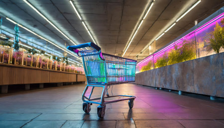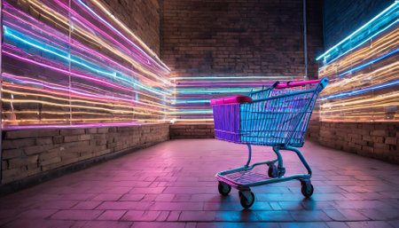 Brightly lit shopping cart featuring bold neon colors, set against a sleek, modern retail environment with ample copy space. Ideal for showcasing innovative retail designs and contemporary