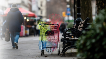 An artistic image presents a shopping cart with a vibrant, colorful vapor trail against a blurred urban backdrop. The scene includes a bench, pedestrians, and foliage. The image's composition suggests potential use for illustrations and various editorial projects, suitable for conceptual or lifestyle themes.