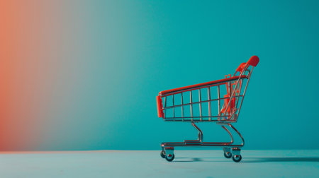 A minimalistic shopping cart against a gradient background of red and blue tones, symbolizing e-commerce, retail, and consumerism in a modern, clean design.