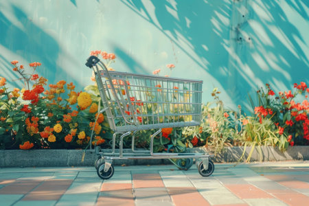 Empty shopping cart is standing near a flower bed, suggesting the concept of shopping for plants and flowers