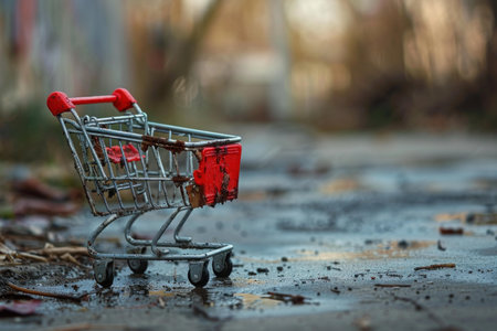 Miniature rusty shopping cart is abandoned in a parking lot, symbolizing economic decline