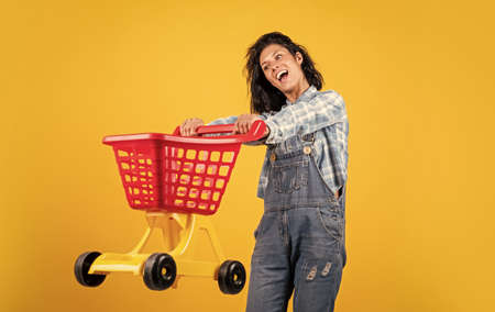 shopaholic. happy girl go shopping. black friday sale. woman with shopping cart. purchase on cyber monday. Shopping and Supermarket concept. woman with shopping cart. Thanks for your purchase