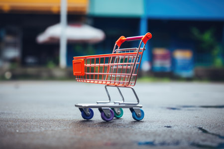 A small shopping cart is sitting on the street, AI