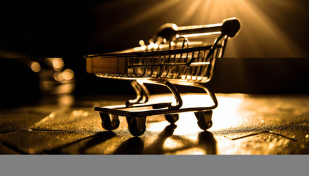 Generative AI, golden shopping cart on dark background with glittered bokeh, Black Friday concept, discount and sale..
