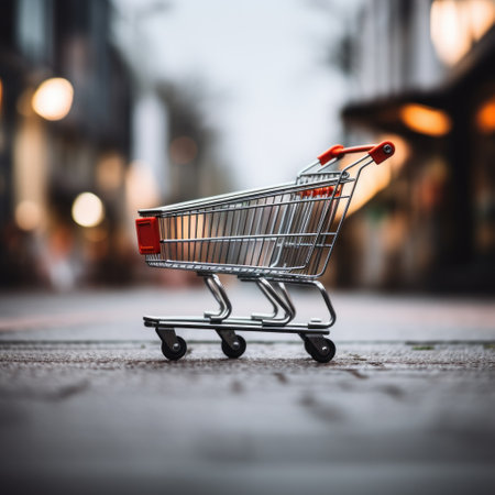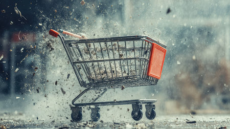 Shopping cart outdoors with a blurred crowd. Represents consumerism and shopping trends. Ideal for discussions on public consumer behavior.