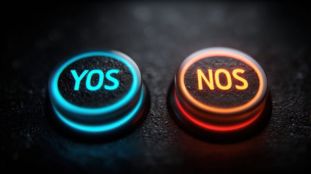 Glowing buttons labeled yes and no are displayed on a dark tech background, representing the idea of making a decision in a digital space.