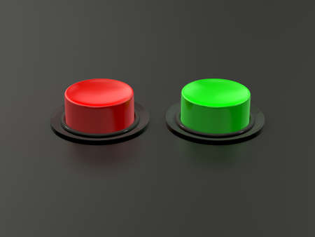 Three buttons in black, green, and red colors are displayed on a gray surface, highlighting sleek design and usability for various applications in technology