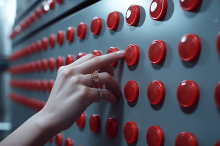 close-up scene where a thumb is delicately pressing on a button that symbolizes control over the world.