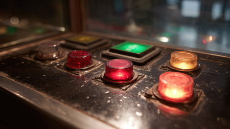 This image captures a close-up of a vintage control panel featuring illuminated push buttons. The details emphasize the wear and age, showing remnants of usage and design.