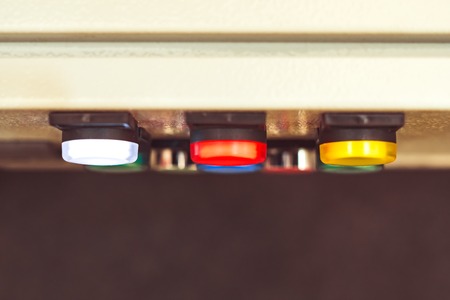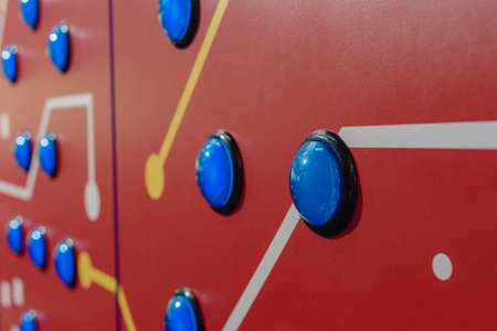 Technical display on control panel with electrical equipment devices cabinet. Empty space above the buttons for your text