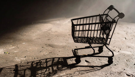 Metal shopping cart standing alone in front of a shuttered store with lights off, symbolizing recession, economic slowdown or reduced consumer activity