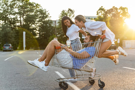 Three diverse friends having fun and riding shopping cart on parking lot near supermarket during summer evening