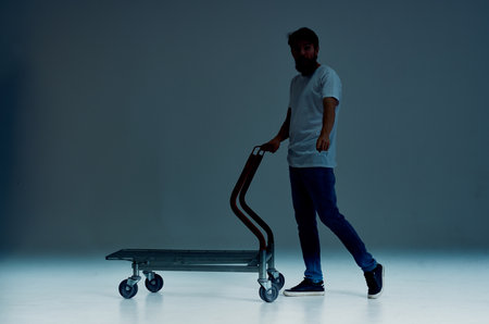 Person on the street approaches a trolley for transporting things, pushes off with his foot and rides on it. The concept of a trip to the shopping and malls