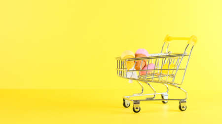 Shopping cart with ice cream inside on a yellow background, closeup. Black Friday Shopping and Discount Concept