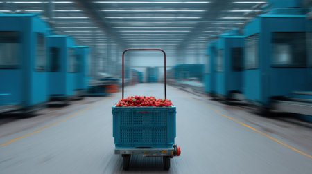 A vibrant blue cart filled with fresh red produce is captured in motion within a spacious industrial warehouse, showcasing the efficiency of logistics and transport.