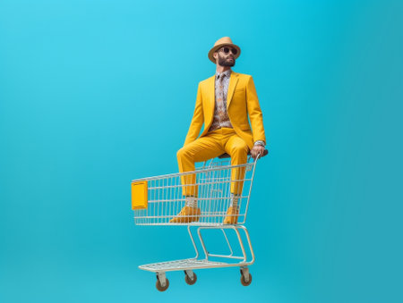 A modern and minimalistic shopping cart placed against a vibrant yellow backdrop, symbolizing retail and commerce.