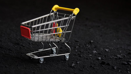 macro close-up of matte black shopping cart front frame casting strong shadow on dark textured surface, minimal industrial retail concept