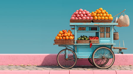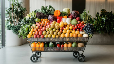 A vibrant cart filled with a fresh variety of fruits and vegetables, showcasing rich colors and natural textures. Perfect for promoting health and nutrition.