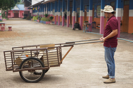Asian man janitor is carrying wheel cart to keep garbage in school. Concept, service occupation. Clean keeper for good environment. Collector garbage to recycle. Service man.