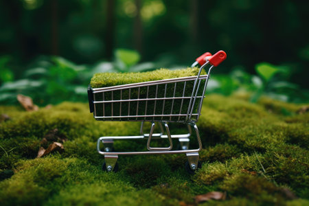 Top view of a shopping cart on green grass with a mossy background minimalism and creative design fo