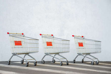 Three Empty Shopping Cart Trolley Stands near Mall with Copy Space. Grocery Cart on the White Wall Store. Trolley at the Supermarket. E-commerce. Shopping Concept. Side View. Black Friday Sale. Online