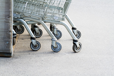 close-up of shopping trolley on gray concrete background with some copy space. Soft focus.