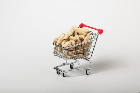 unshelled peanuts in the supermarket trolley, isolated on white background